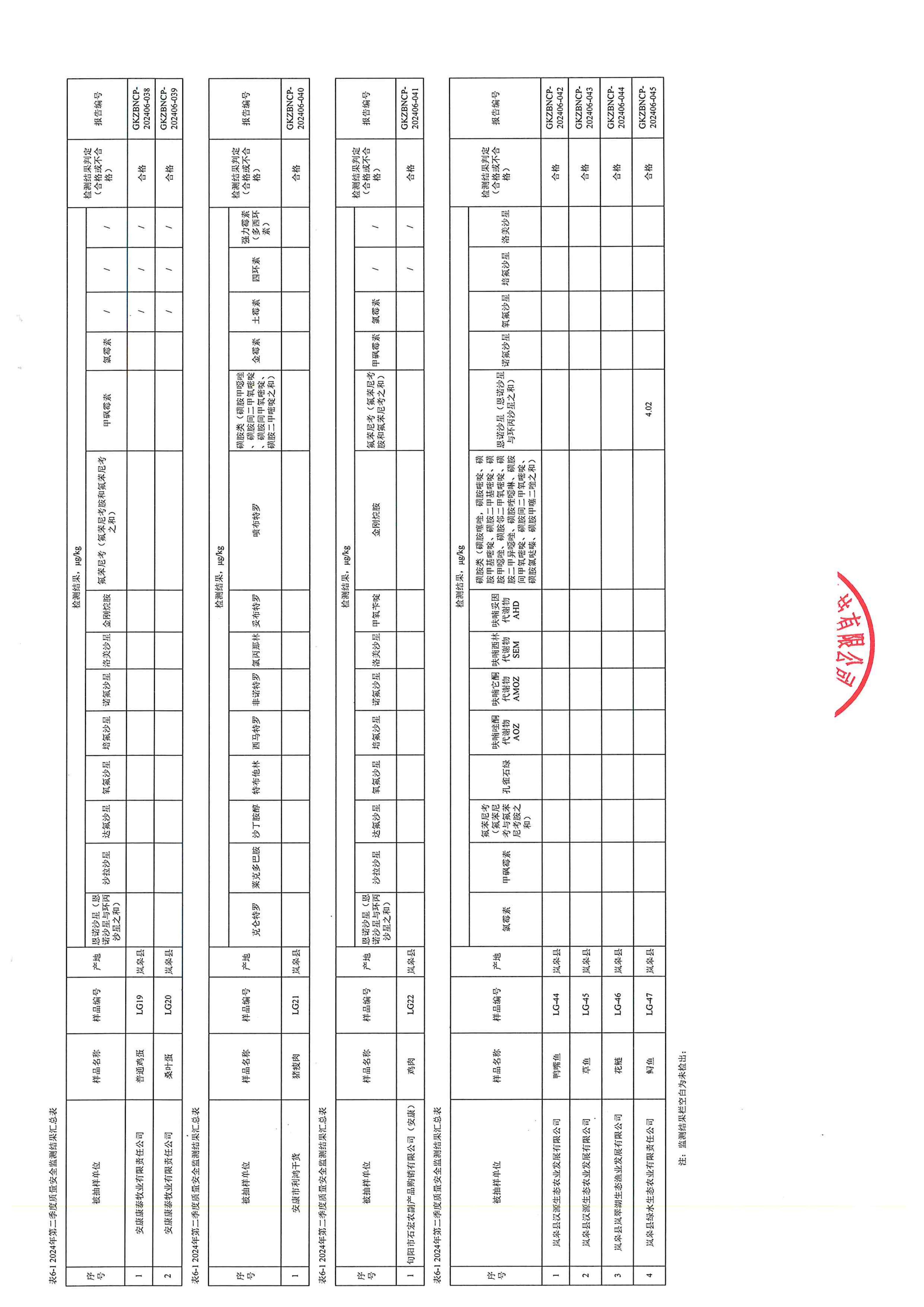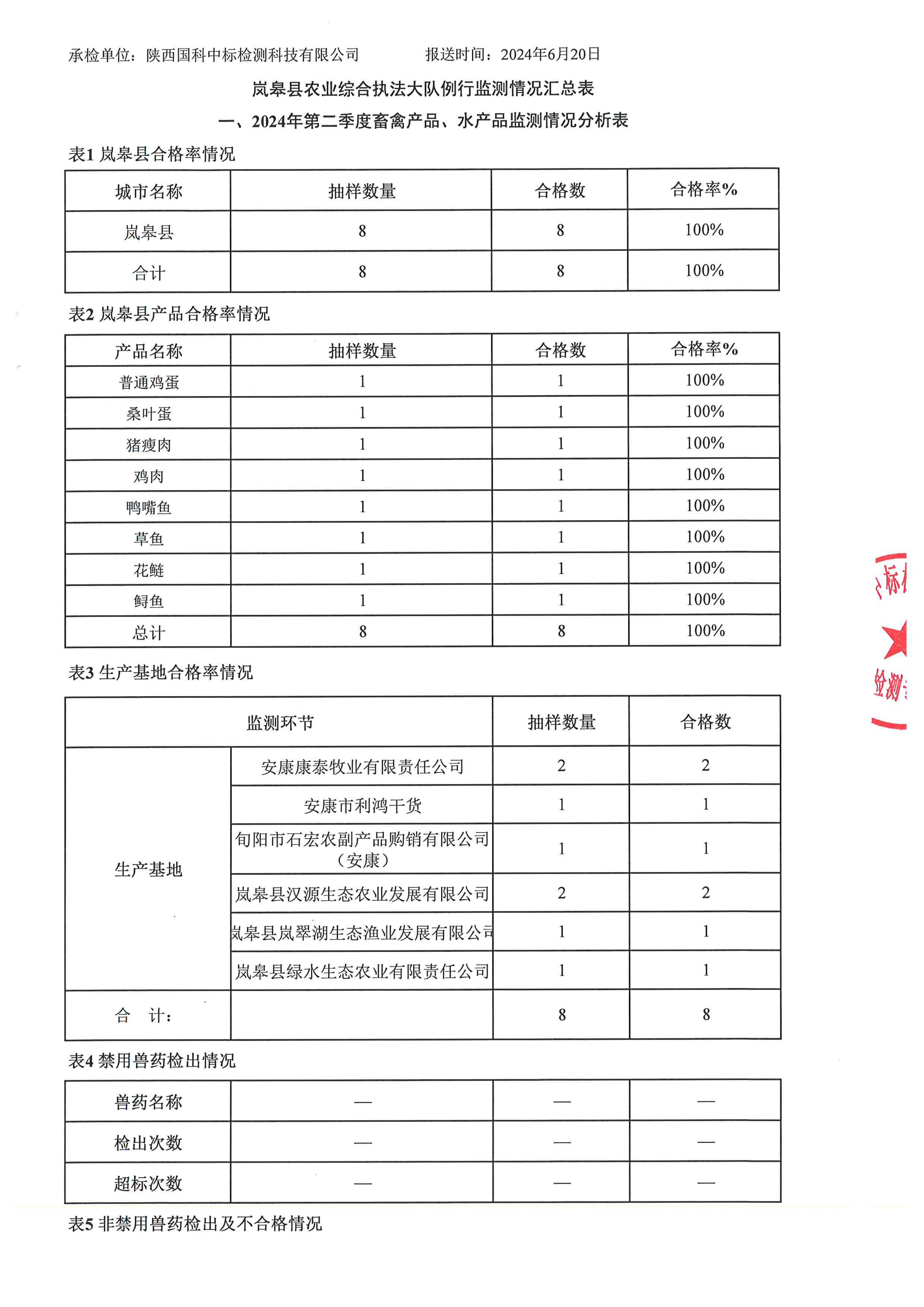 岚皋县农业综合执法大队2024年第二季度畜产品、水产品例行监测情况汇总表