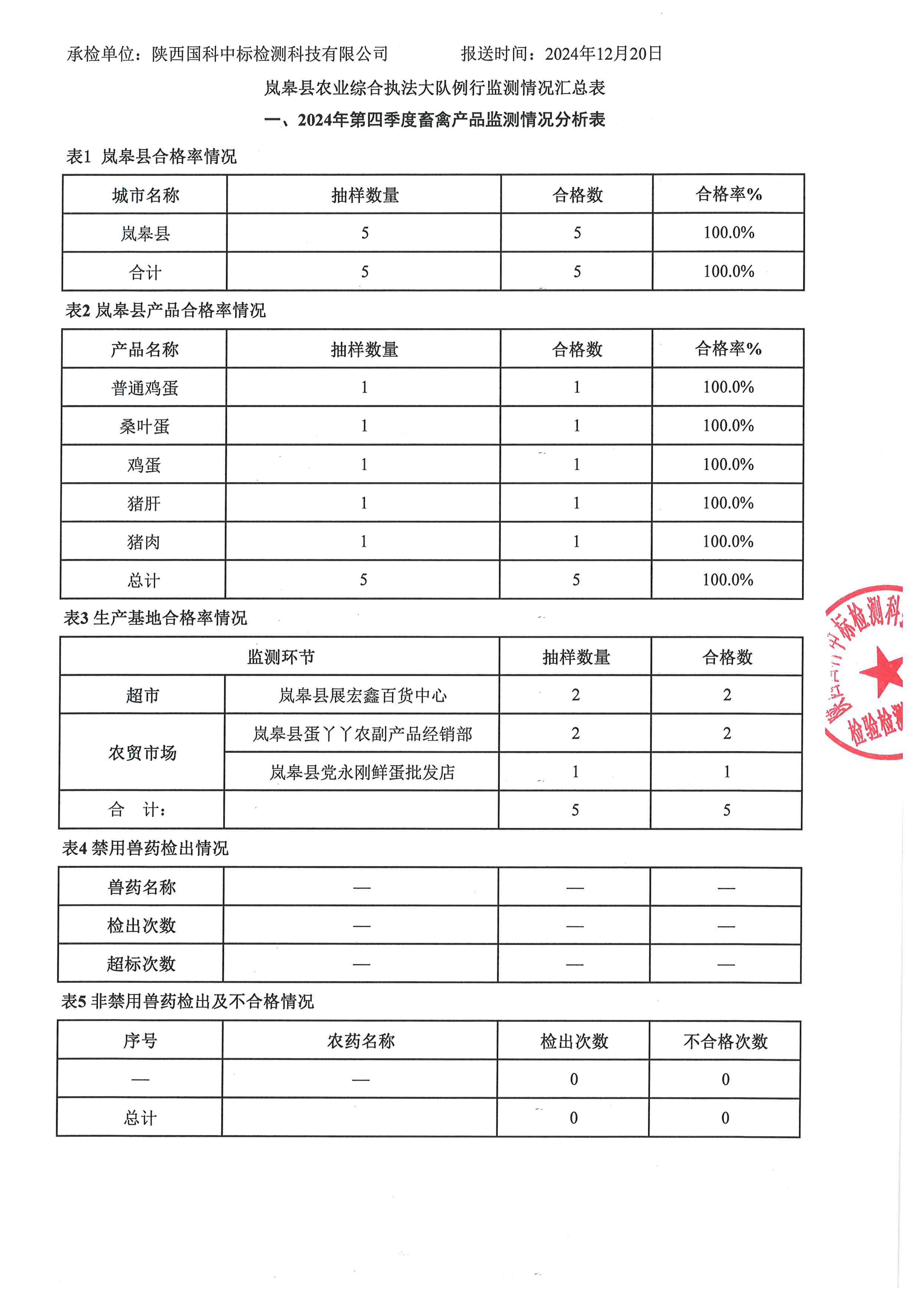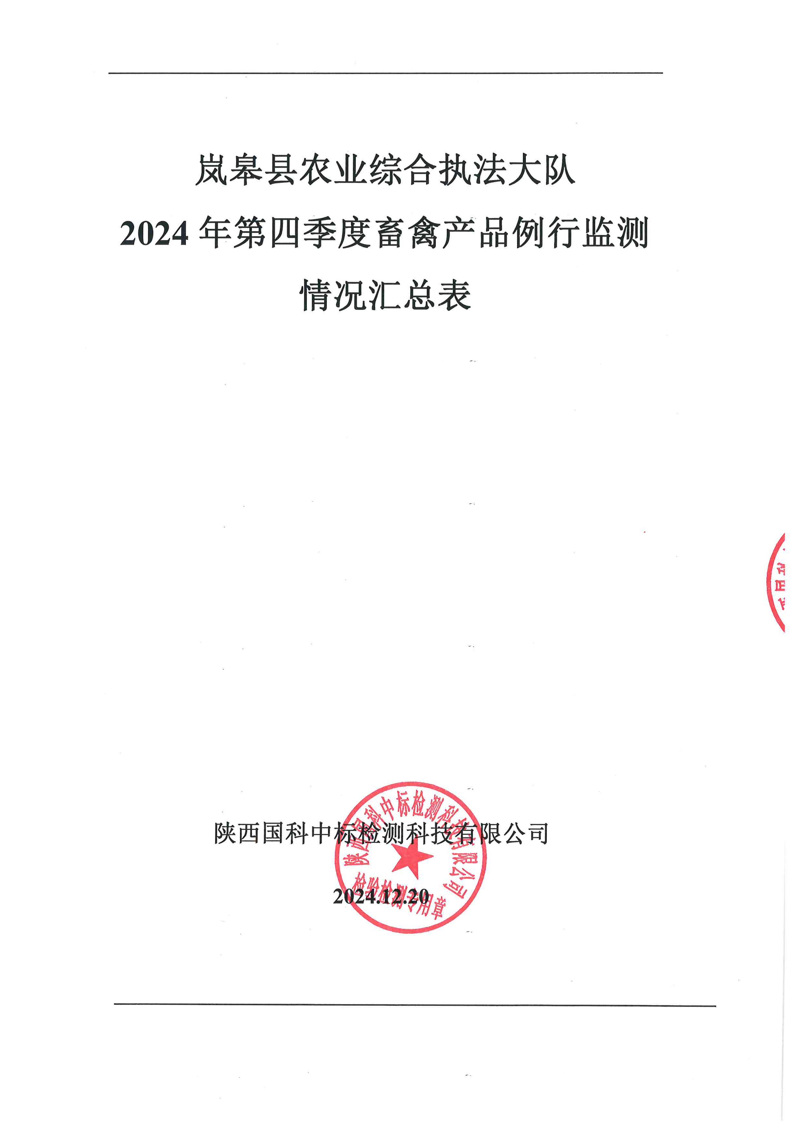 岚皋县农业综合执法大队2024年第四季度畜禽产品例行监测情况汇总表