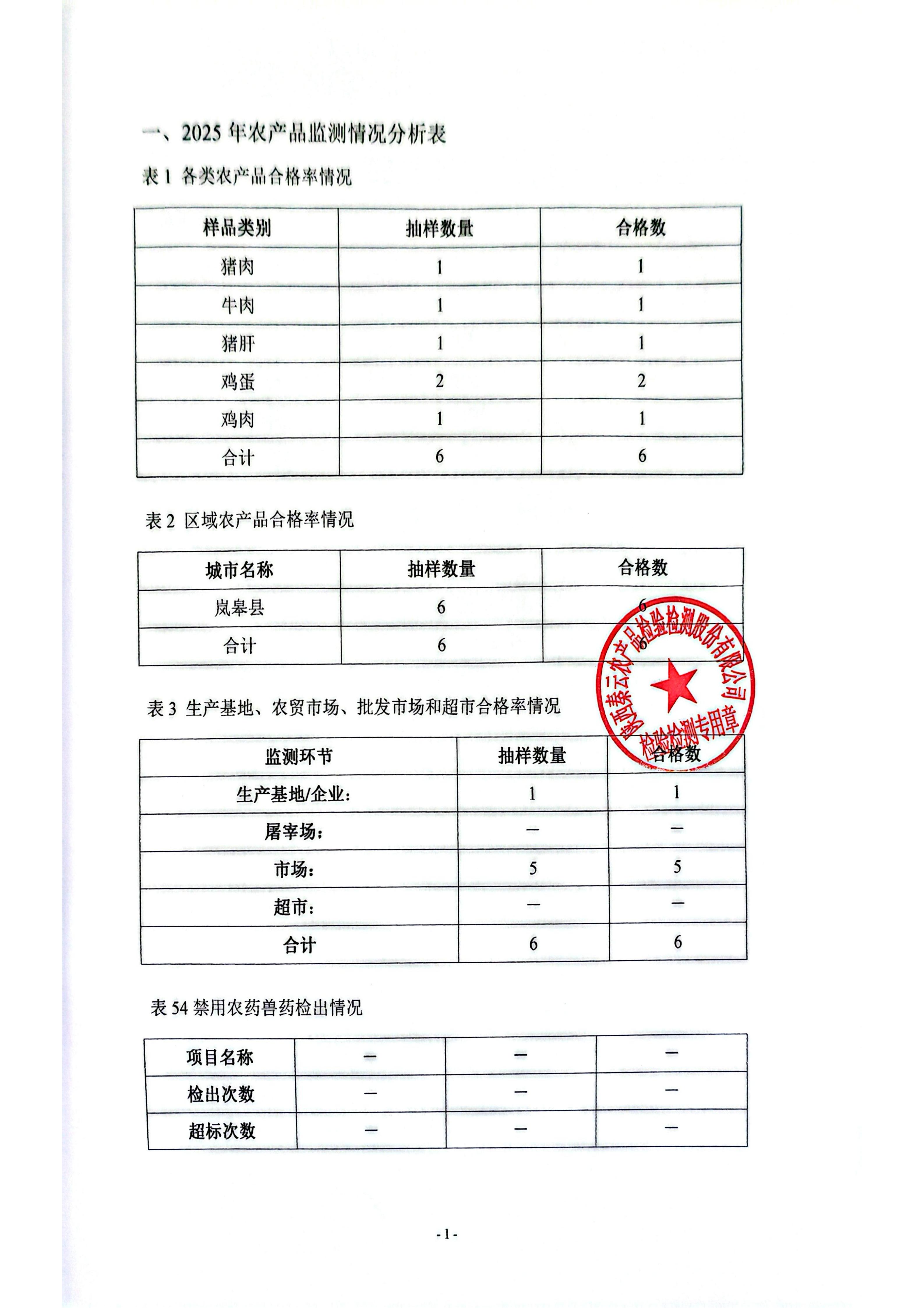 岚皋县农业综合执法大队2025年第一季度农产品例行监测情况汇总表